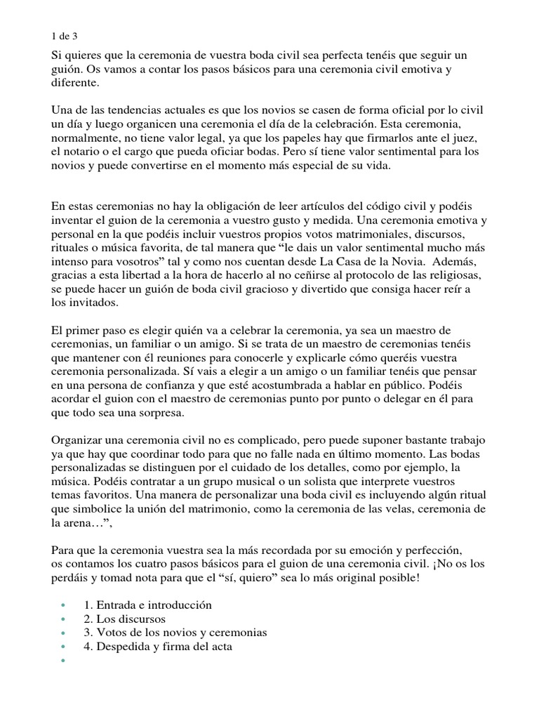Votos matrimoniales y discursos para bodas. A pesar de que un matrimonio civil no se celebra por la iglesia, la recepción se puede preparar tal como si se prepara una gran fiesta, se baila el vals, se hace un gran pastel y por su puesto se preparan hermosos discursos o discursos para bodas civiles graciosos. Español, francés, inglés, alemán, sueco, holandés, italiano, portugués y ruso en la. Alguien muy especial está a punto de casarse y te ha encargado la misión de leer un discurso en su boda y, a pesar de que coleccionas millones de anécdotas con él o ella, no. Si se os da bien esto de escribir podéis escribir algo original para leer en esos momentos pero si sois de los que os bloqueáis ante un papel pues.